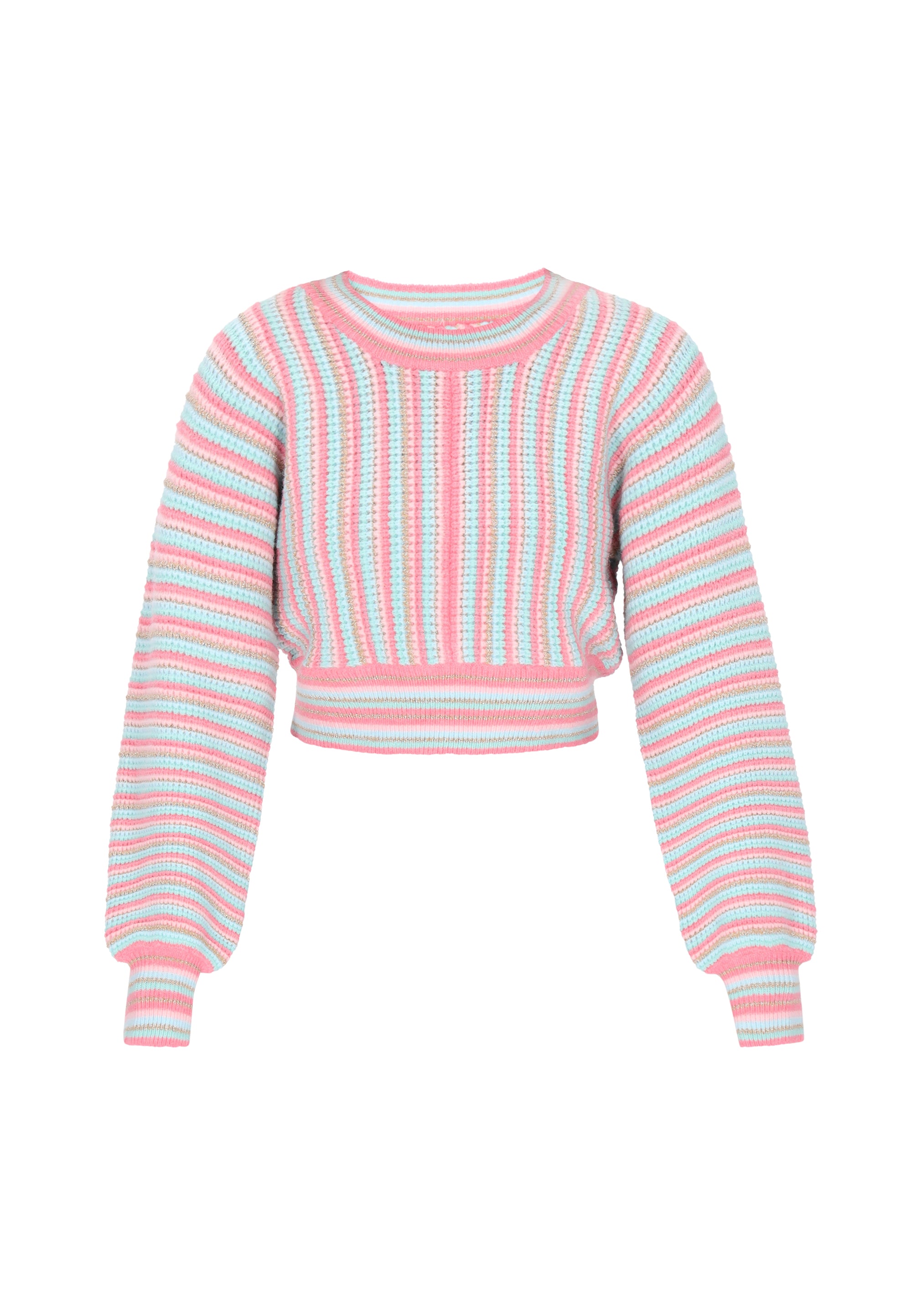 Keyword: bishop sleeves, casual, comfortable, cozy, cropped, fashion look collection, knitted, long sleeves, relaxed fit, round neck, shiny thread, stripes pattern, sweater