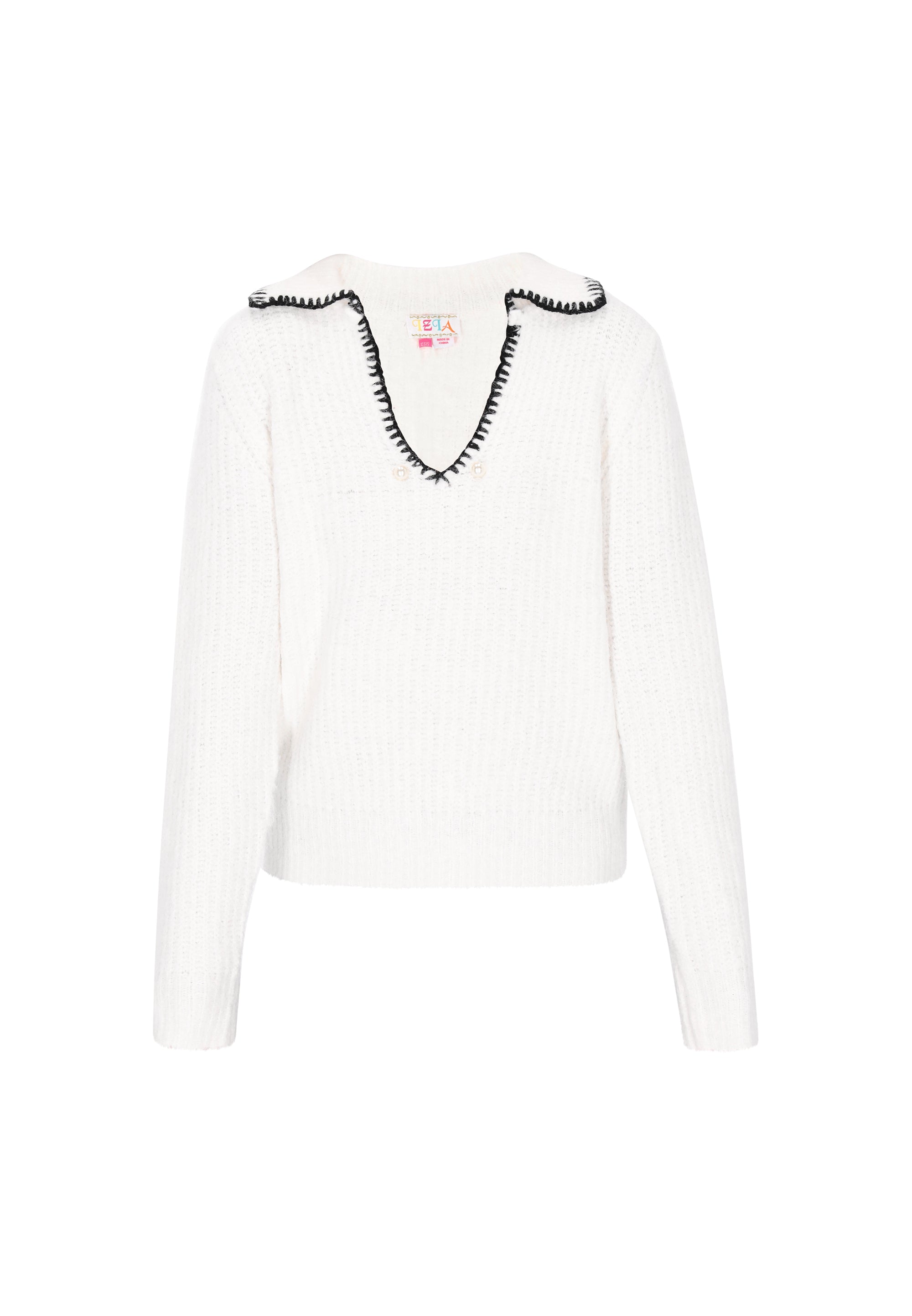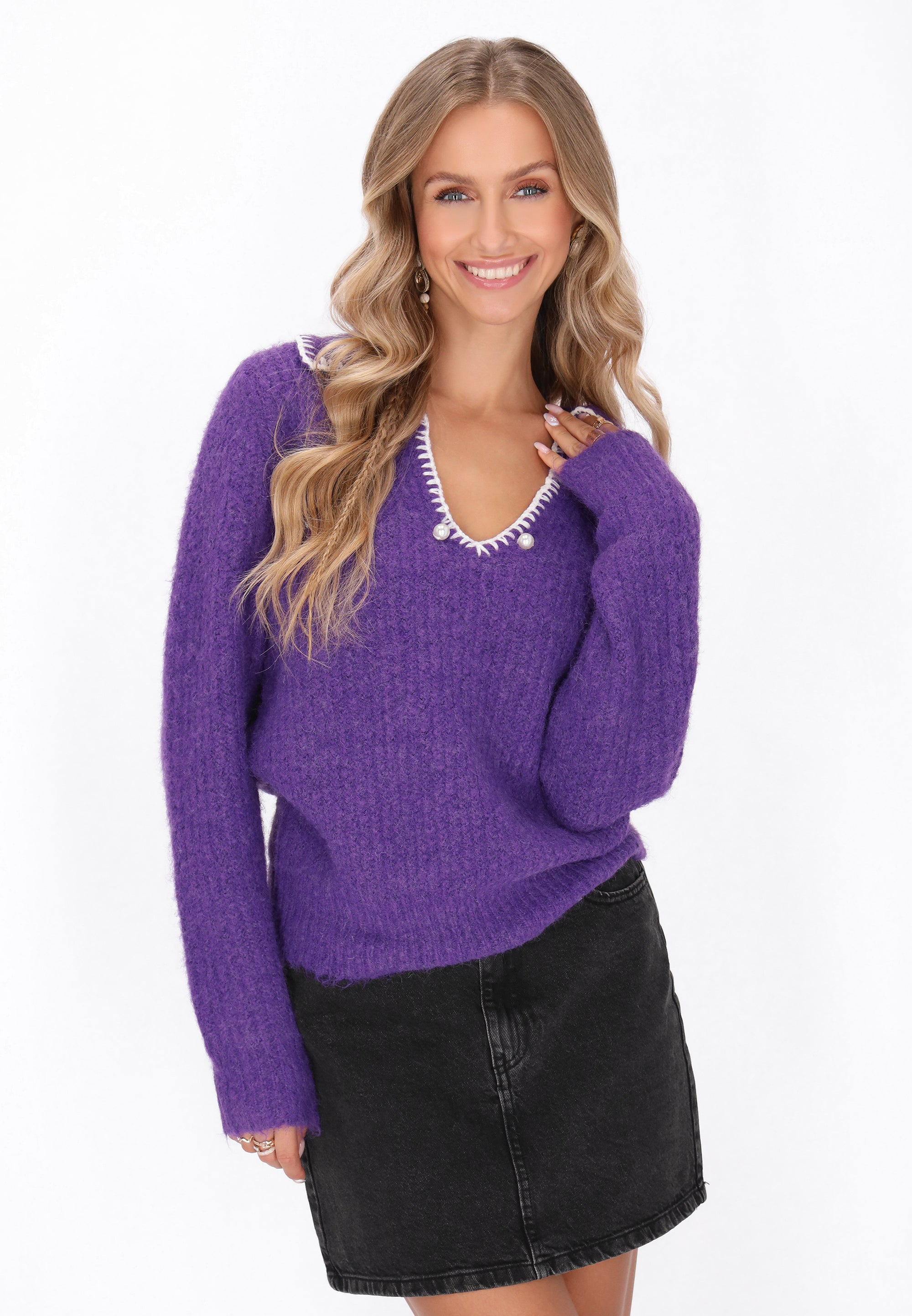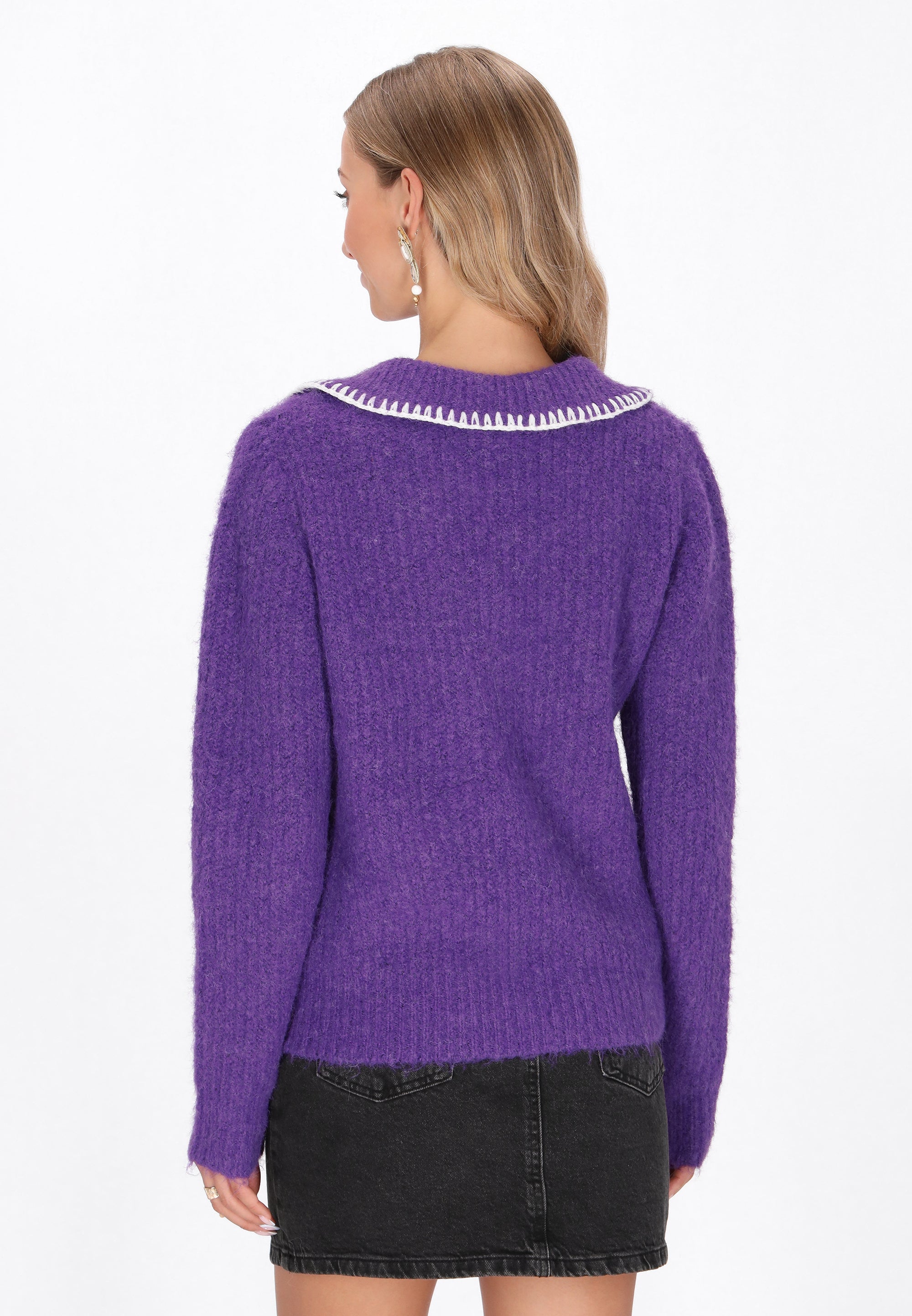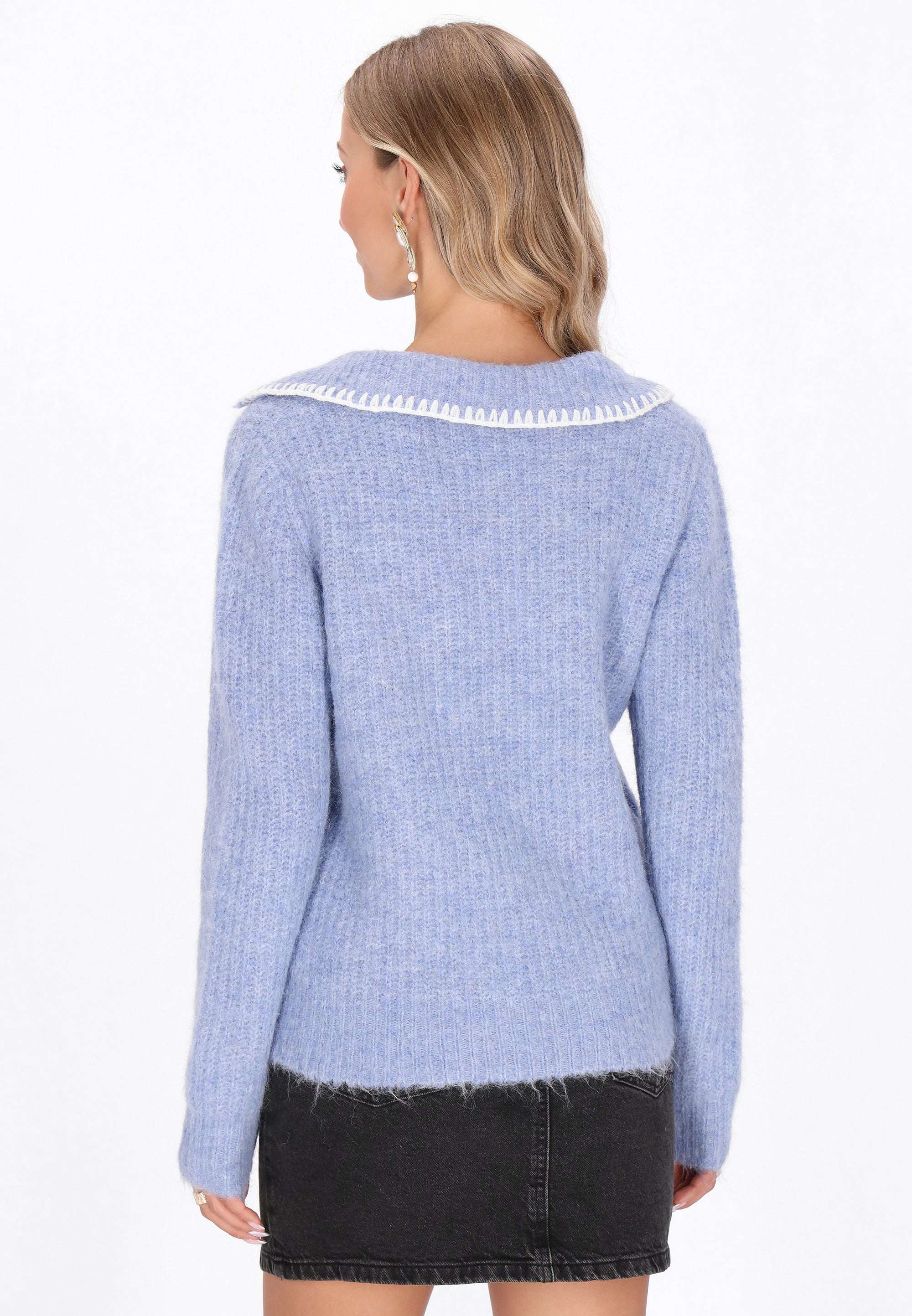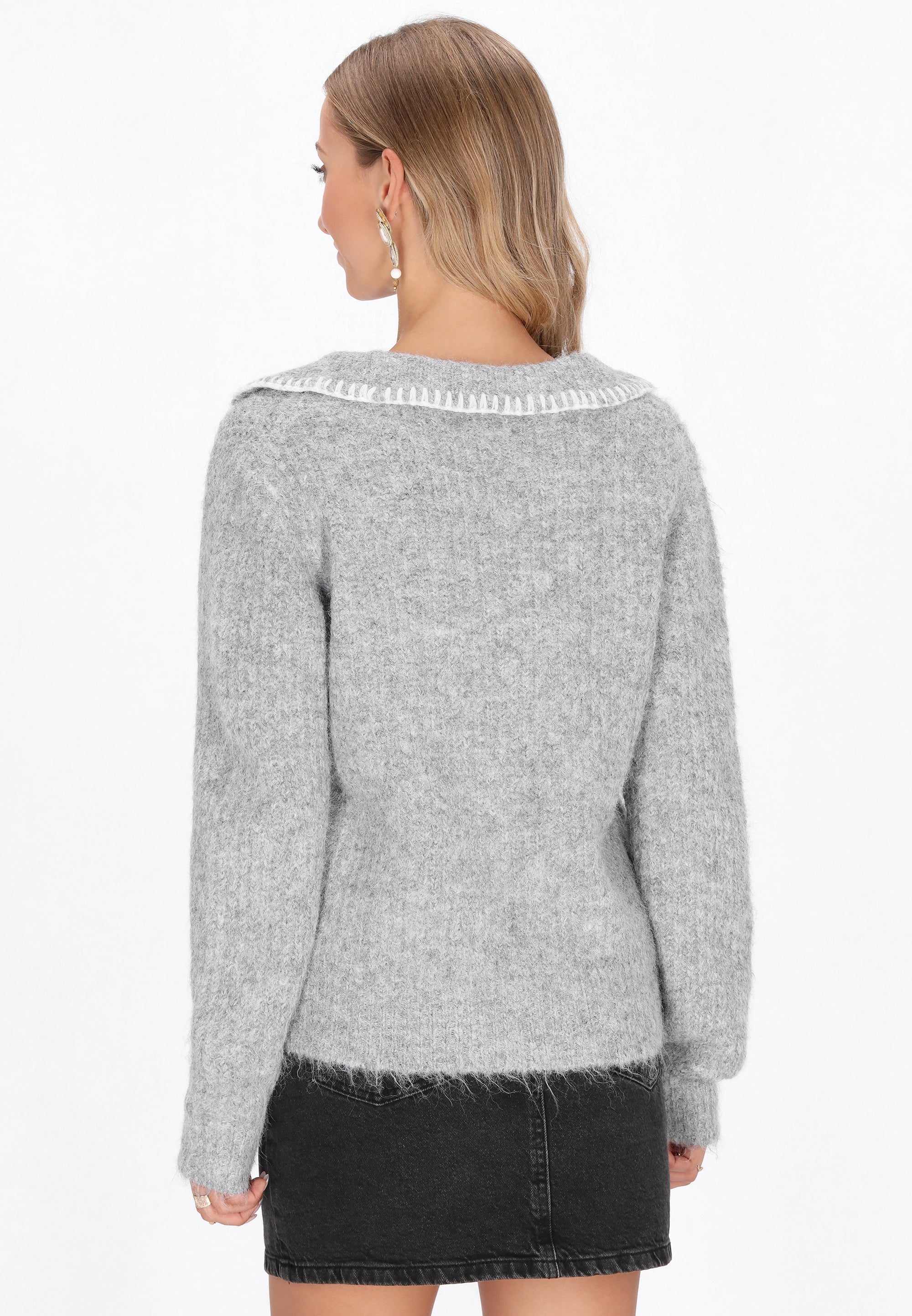 Sweter o regularnym kroju z dekoltem w serek i klasycznym kołnierzem. Wykonany z miękkiej, dzianinowej tkaniny o gładkim wzorze, posiada kontrastowe lamówki i subtelne perłowe akcenty dla odrobiny szyku. Długie rękawy zapewniają komfort, a jego casualowy styl sprawia, że jest idealnym dodatkiem do codziennych stylizacji. Przytulny, wygodny i modny – ten kardigan z kolekcji Fashion Look.