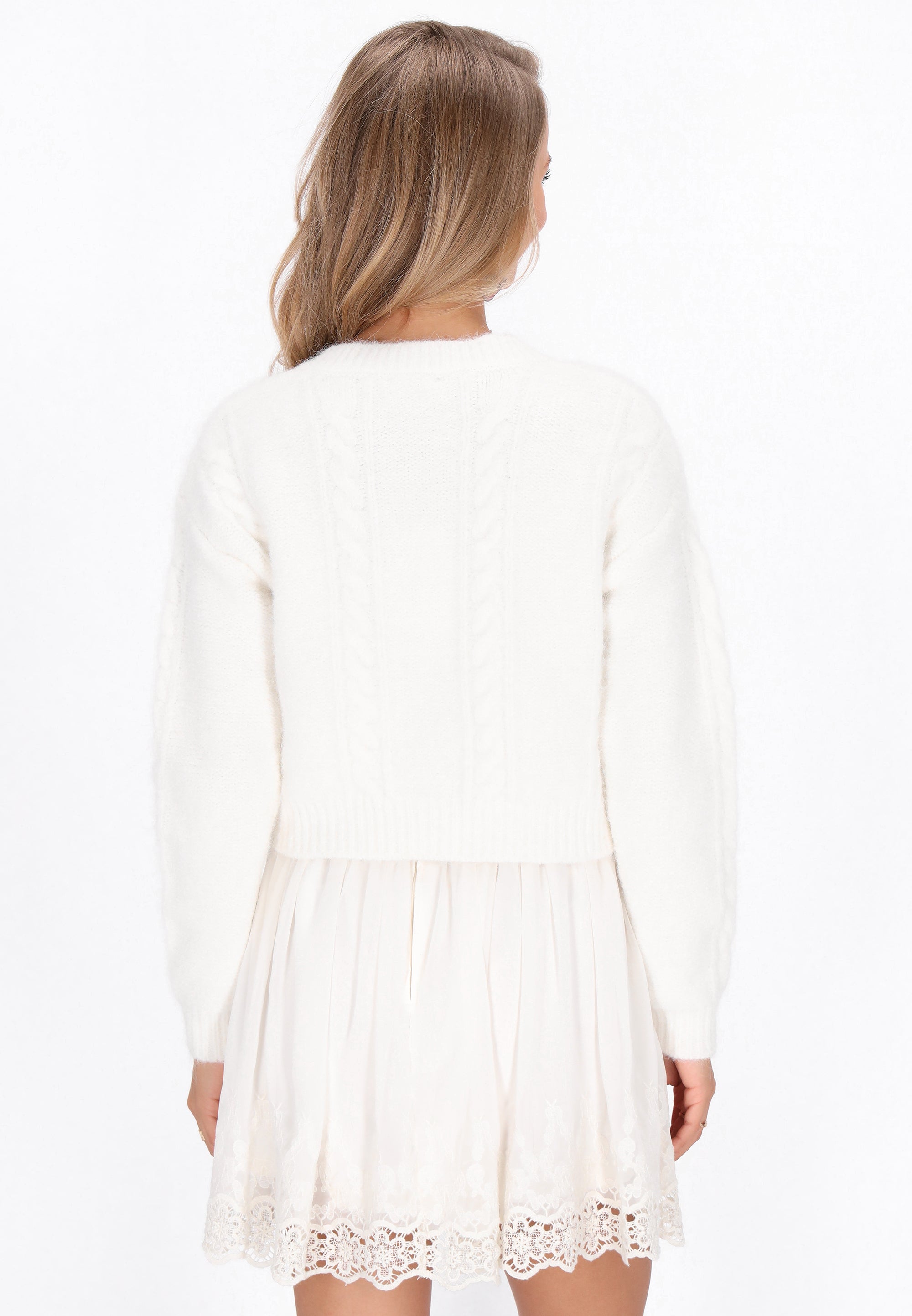 Sweter z kolekcji Fashion Look – klasyczne połączenie wygody i stylu. Ten luźny sweter wykonany jest z miękkiej, komfortowej dzianiny z modnym wzorem warkocza. Posiada okrągły dekolt, długie opuszczane rękawy oraz zapięcie na guziki dla łatwego stylizowania i dodatkowej funkcjonalności. Subtelne kwiatowe hafty sprawiają, że sweter jest zarówno casualowy, jak i kobiecy. Idealny do codziennych stylizacji, zapewnia komfort i przytulność, pozostając w zgodzie z aktualnymi trendami mody.