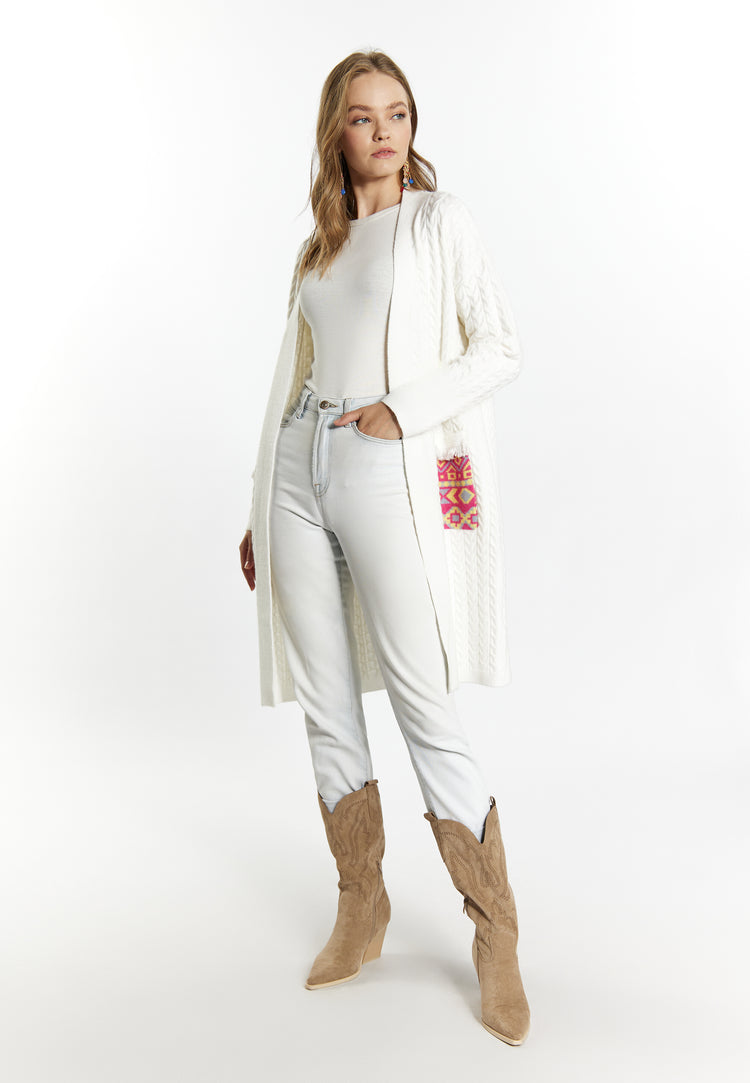 With the long, open cardigan from IZIA you will feel a feeling of sun, beach and sea even on cool autumn-winter days. The reason for this is the soft, dimensionally stable yarn mixture with a cable pattern and the bags with fringes knitted in an ethnic pattern.