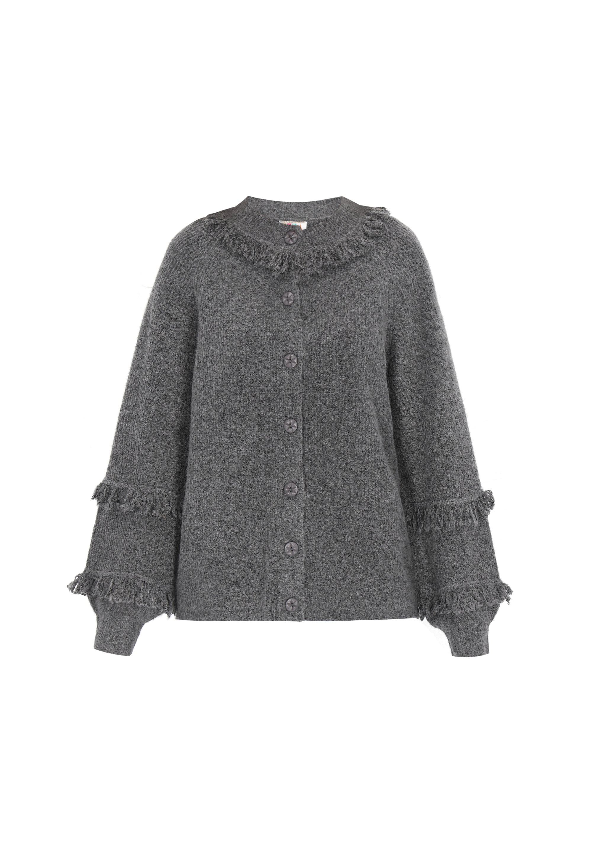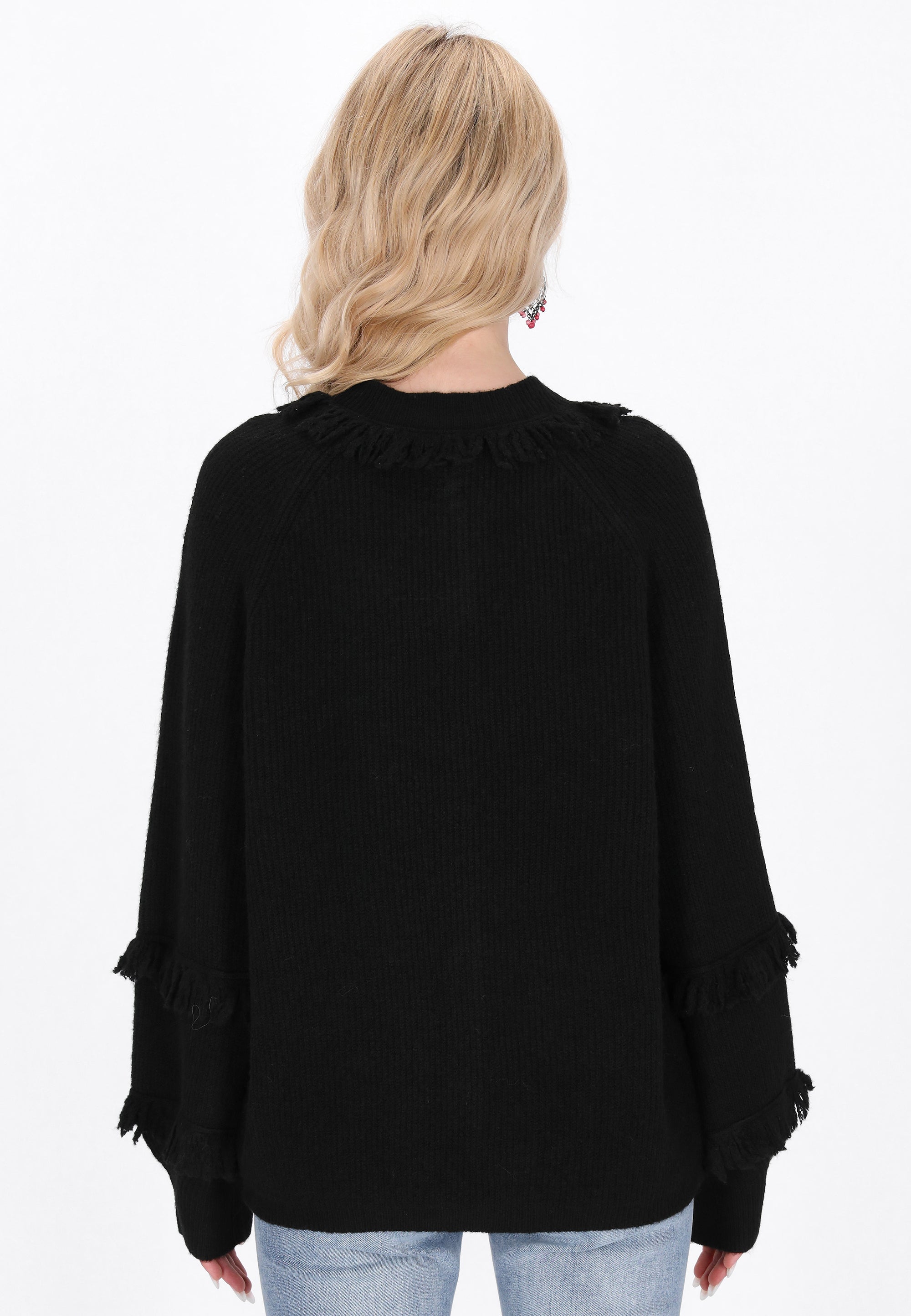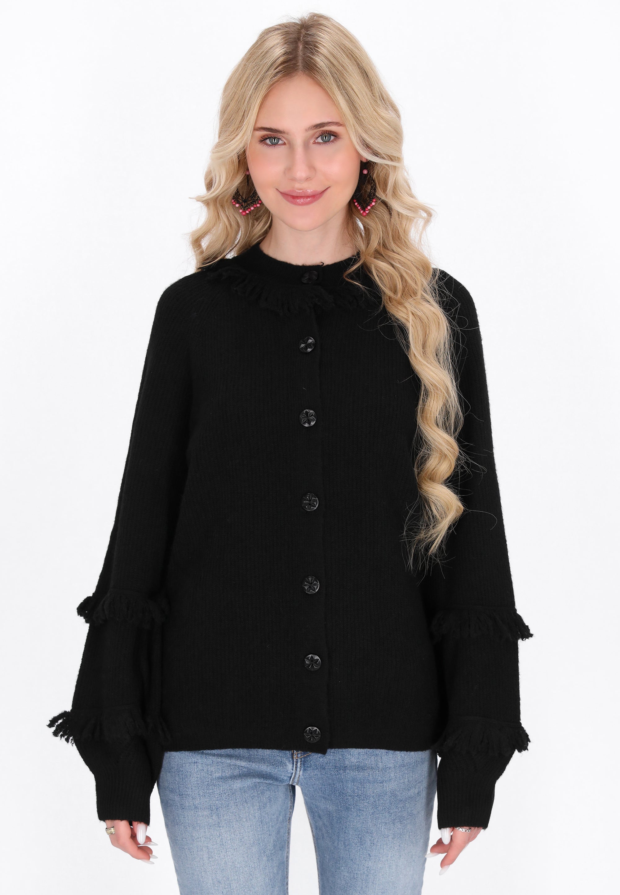 Go for a casual look with this loose-fitting cardigan, designed for ultimate comfort. With a round neckline and long bishop sleeves, it exudes boho charm. The button-front closure and fringe accentuate its playful knit texture, making it perfect for everyday wear while ensuring comfort with any outfit. Part of the Fashion Look Collection.