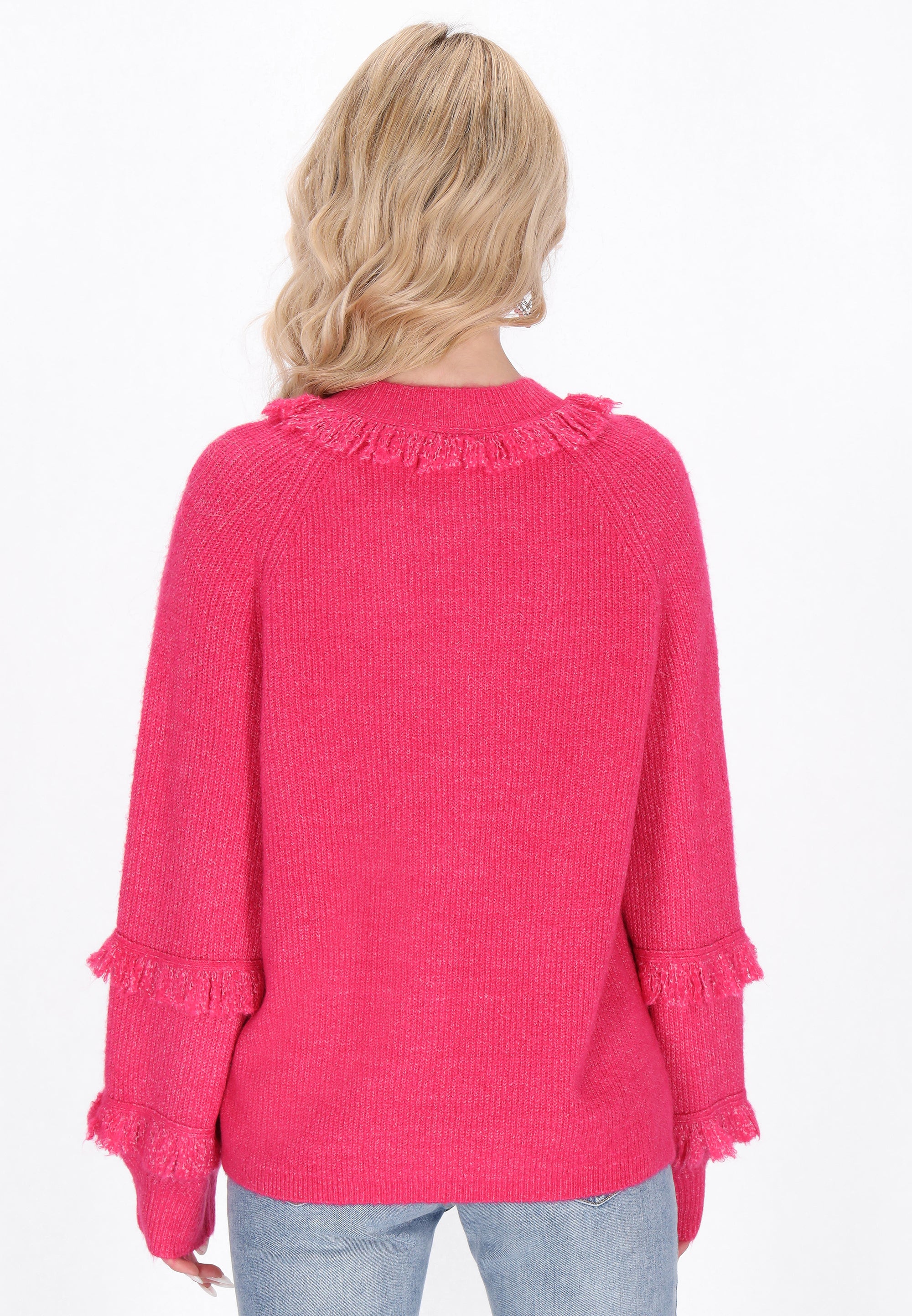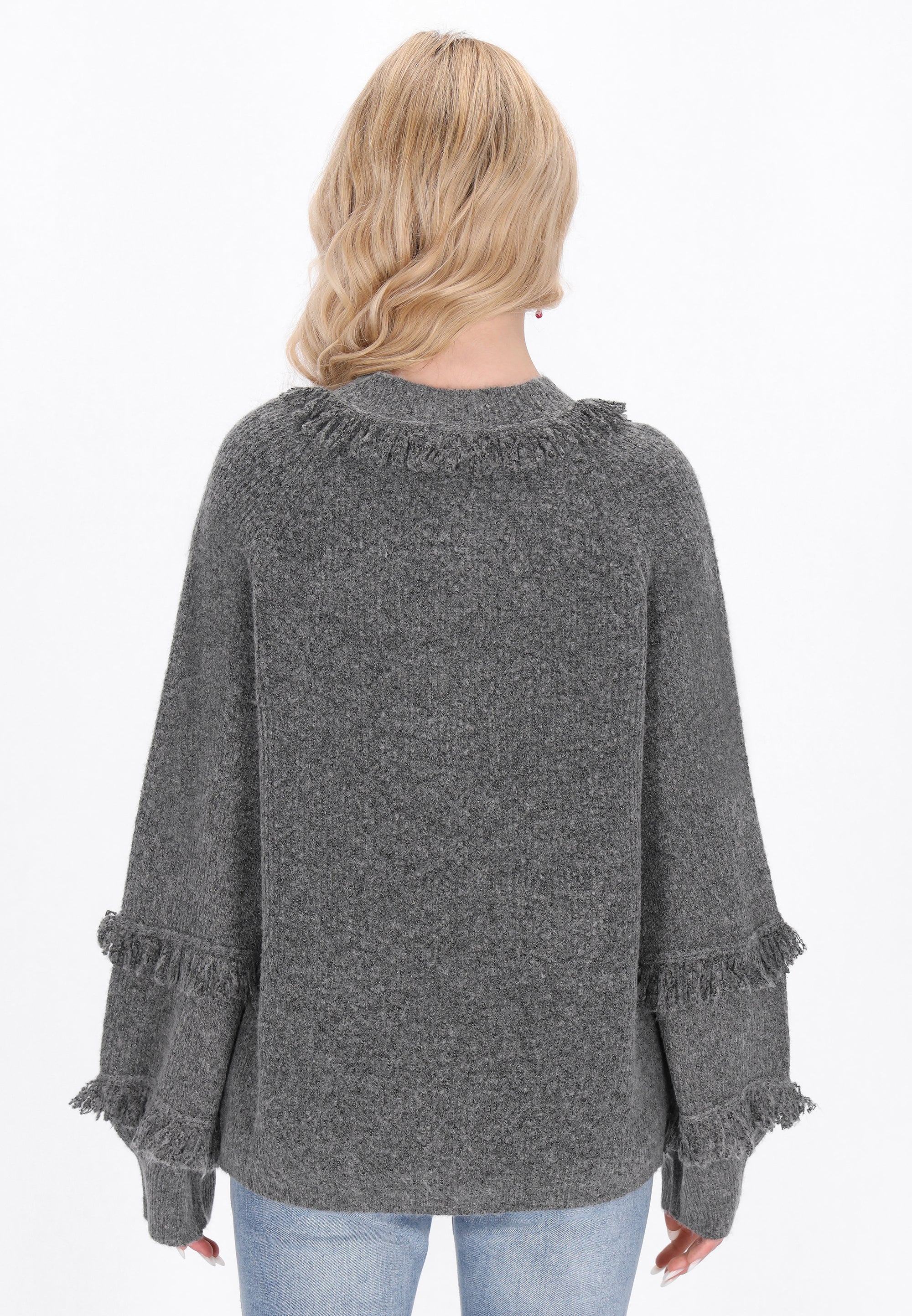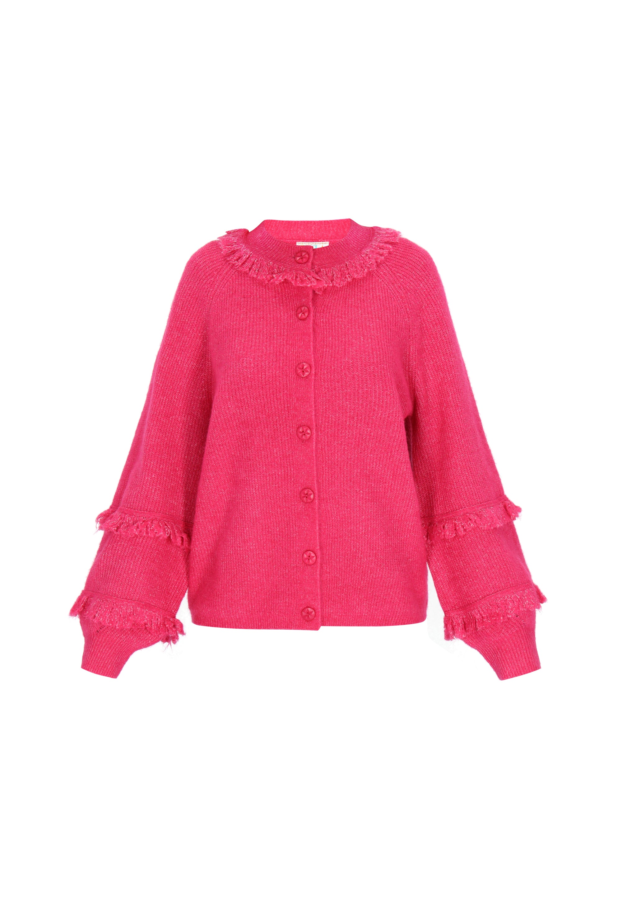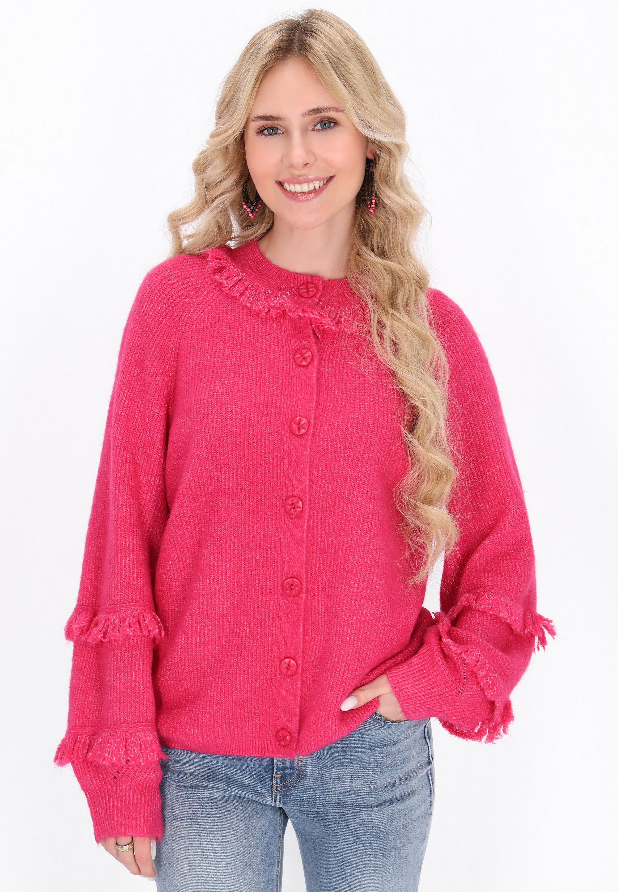 Go for a casual look with this loose-fitting cardigan, designed for ultimate comfort. With a round neckline and long bishop sleeves, it exudes boho charm. The button-front closure and fringe accentuate its playful knit texture, making it perfect for everyday wear while ensuring comfort with any outfit. Part of the Fashion Look Collection.