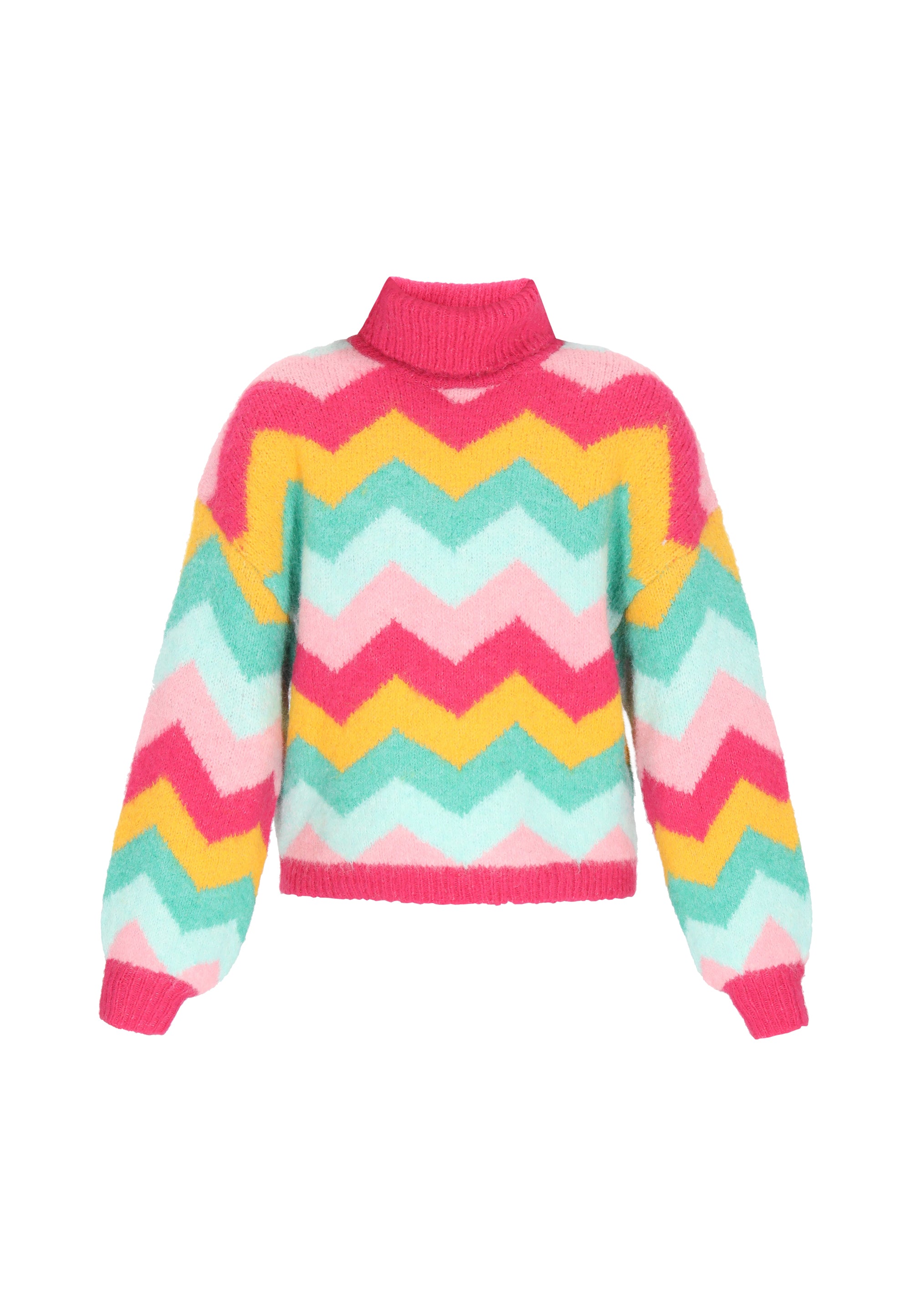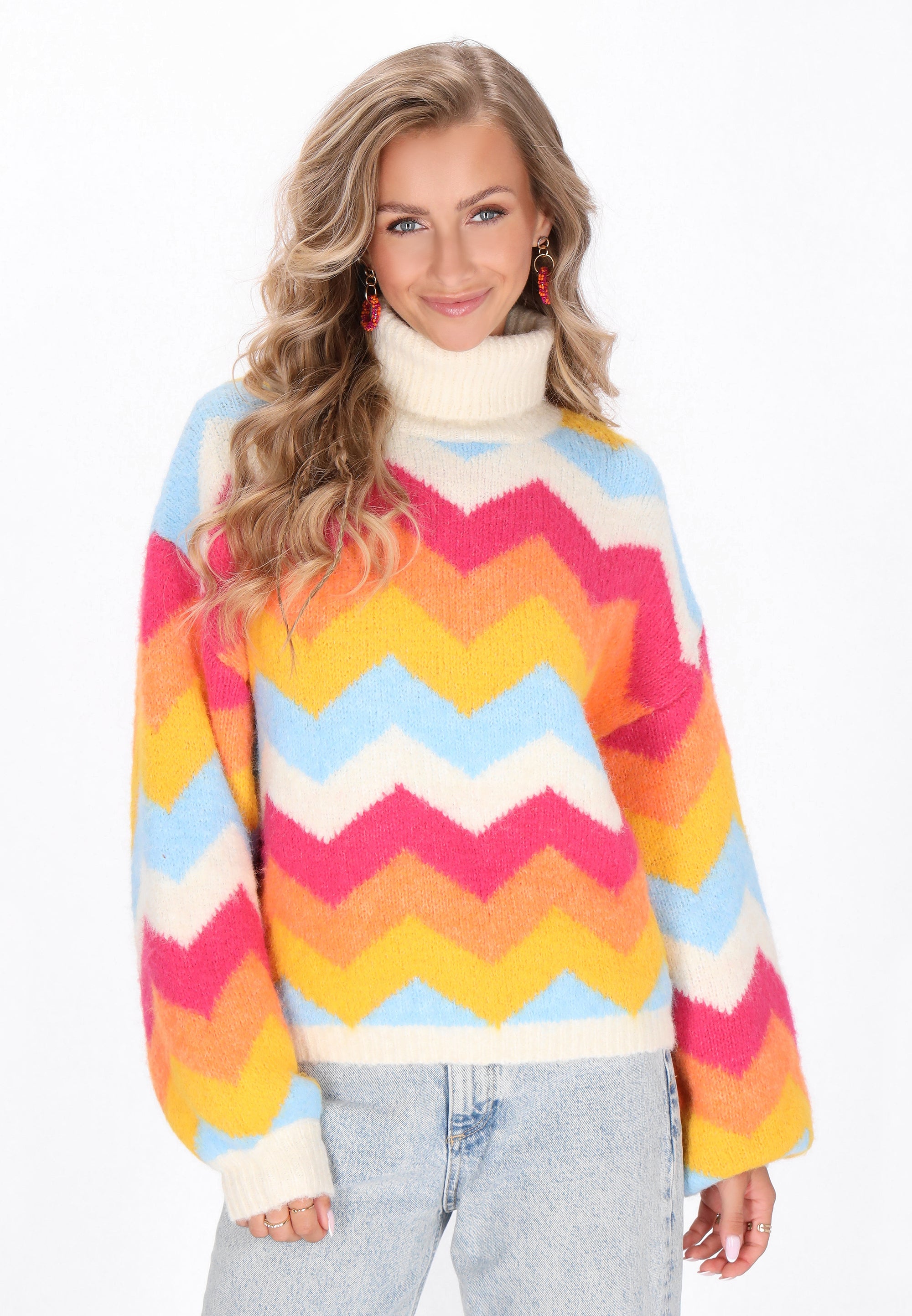 This cozy sweater has a loose fit and a stylish turtleneck for warmth. The long bishop sleeves have delicate buffets that enhance the casual style. Made of knitted fabric, it showcases an eye-catching zigzag pattern that adds to the ethno-inspired style. This comfortable sweater from the Boho Collection is perfect for cooler days.