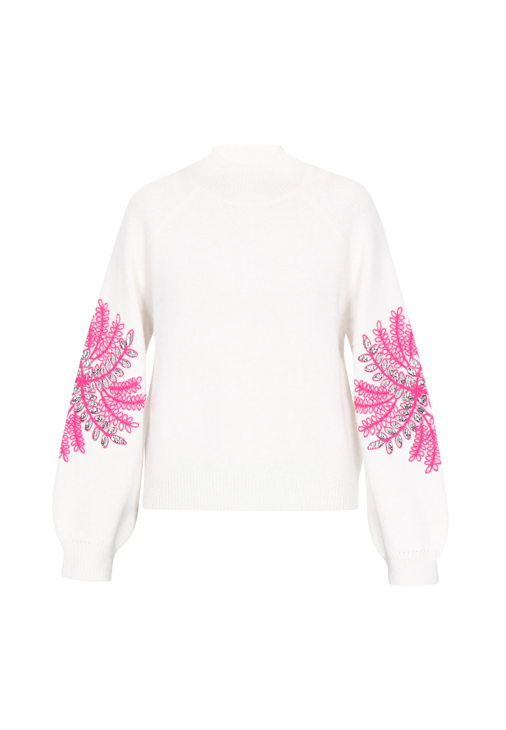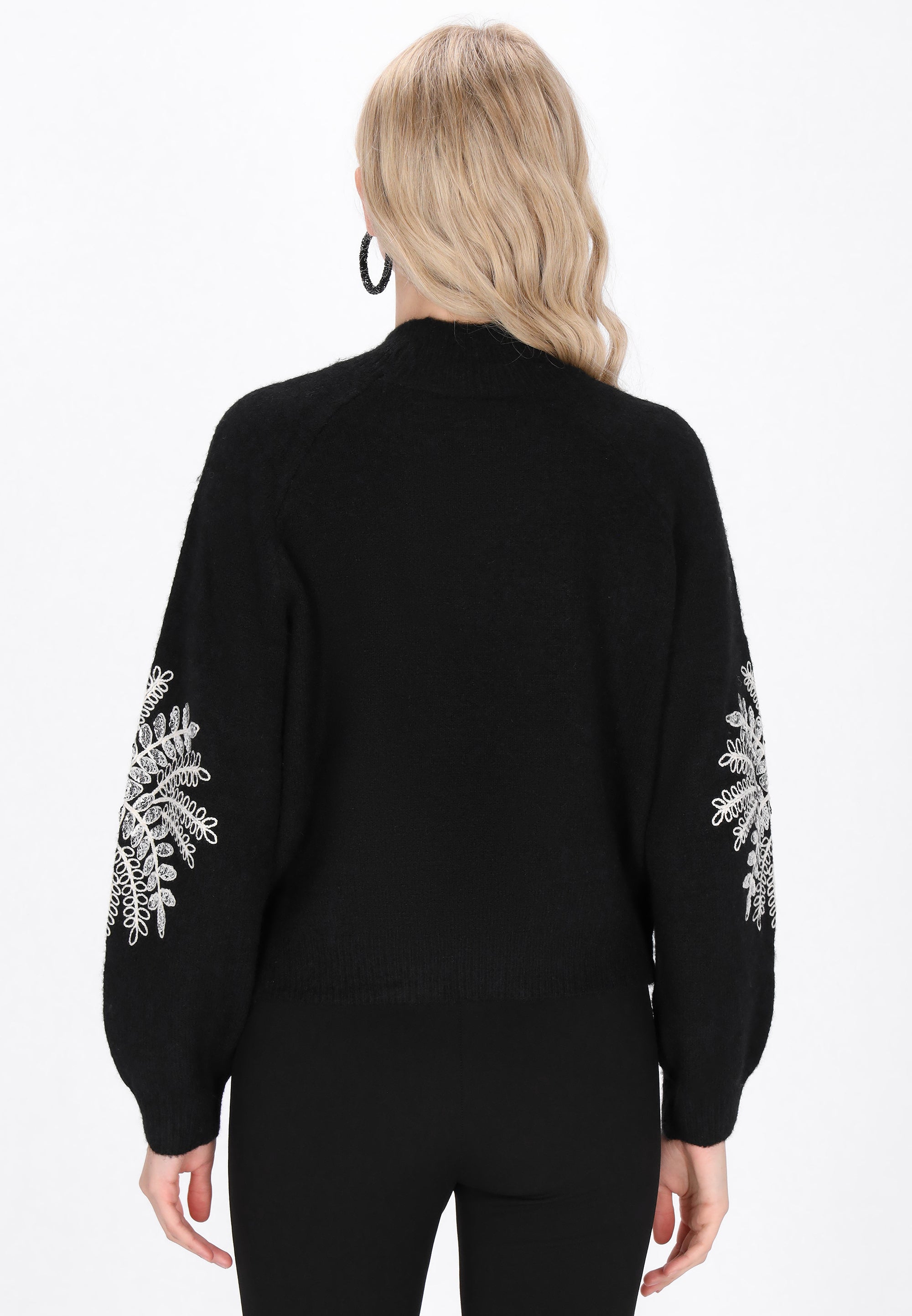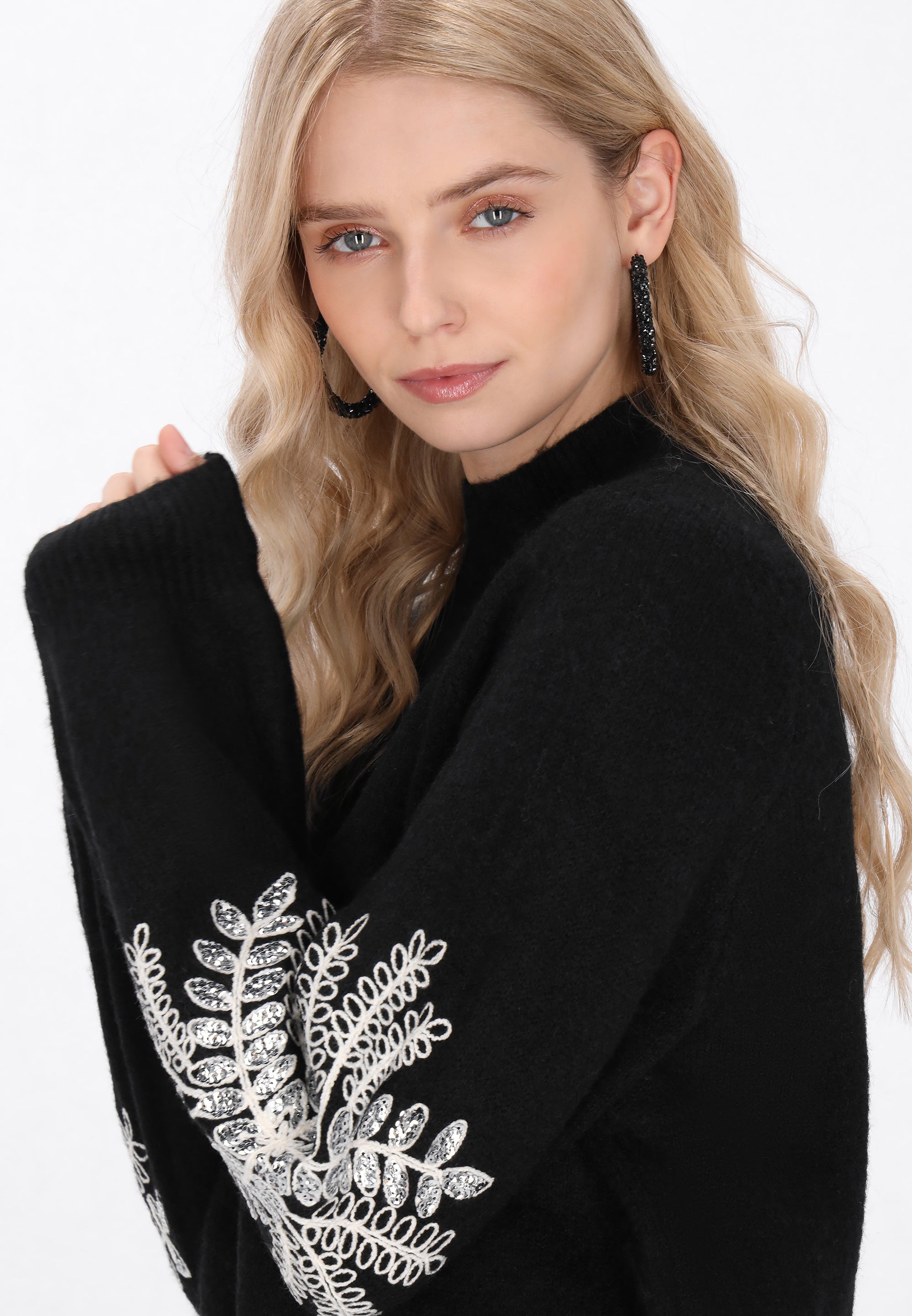 Keyword: bishop sleeves, boho collection, comfy, ethno, floral embroidery, knitted, long sleeves, plain pattern, raglan, relaxed fit, sequins, stand collar, sweater