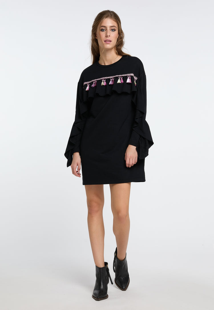 In addition to a striking ruffle that runs across the entire model, a border with colorful tassels adorns the long sweatshirt from IZIA. The model, made from a soft material with cotton, has a plain-colored design and impresses with its slight waist. No matter whether you wear it as a dress or as a long sweater with slim trousers, it will surround you with a sunny feeling at all times.