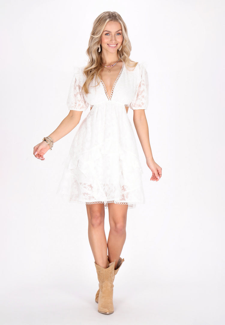 This mini dress has a regular fit with a deep V neckline and short, buff sleeves for a stylish look. It features cutouts, an embroidered band and ruffles at the bottom, so it exudes a romantic boho vibe. Elastic cuffs add a touch of style to this woven floral patterned model, combining whimsy with elegance. This dress is part of the Fashion Look Collection.