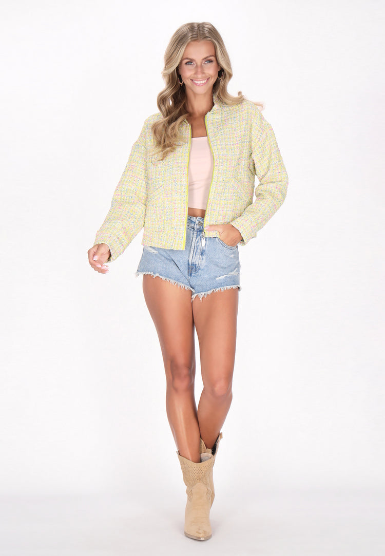 Upgrade your wardrobe with this stylish lightweight jacket in a regular fit. Featuring a smart round neckline and long sleeves, this zipped jacket is both functional and fashionable. Pockets for comfort and the unique woven Boucle pattern make it the perfect addition to your everyday fashion collection for a trendy look. It is part of the Fashion Look Collection.