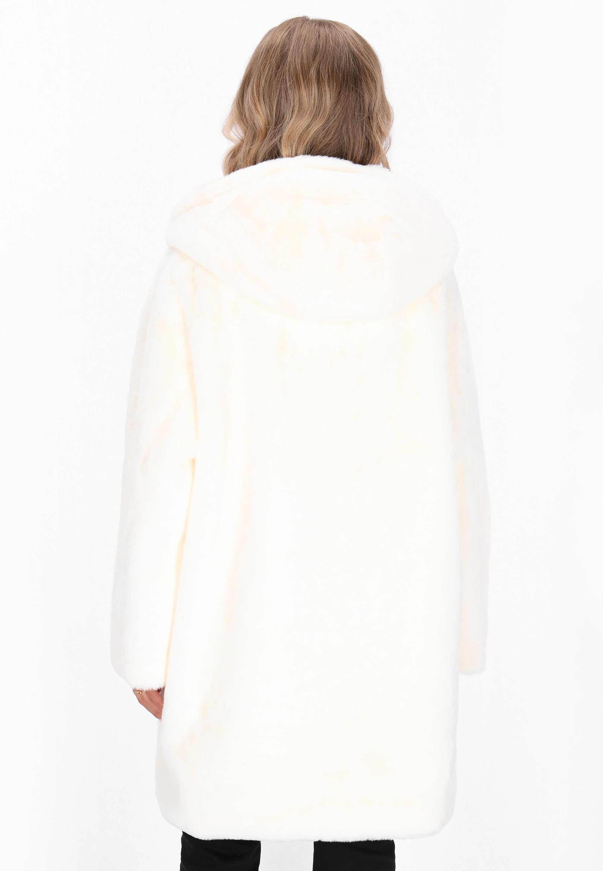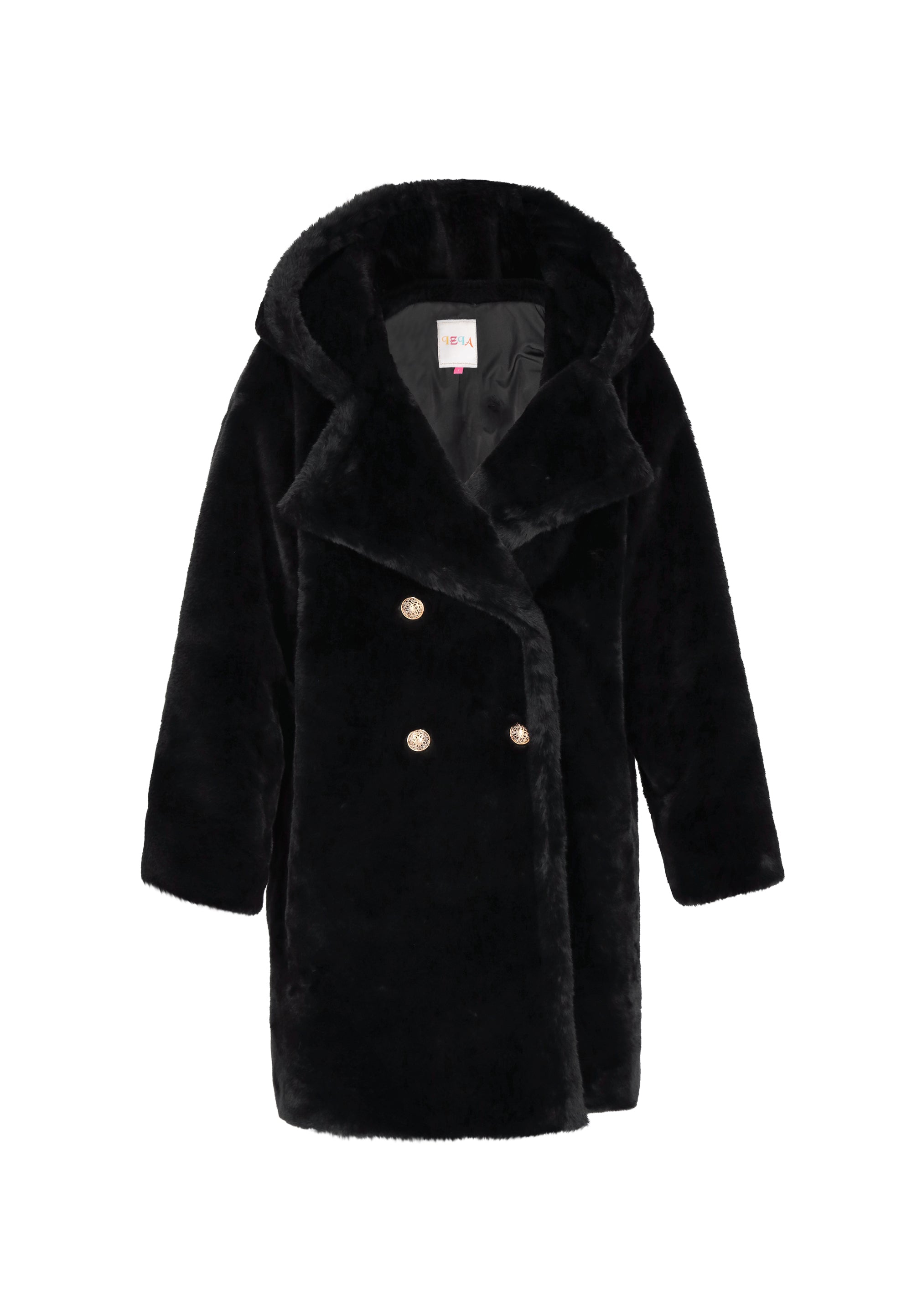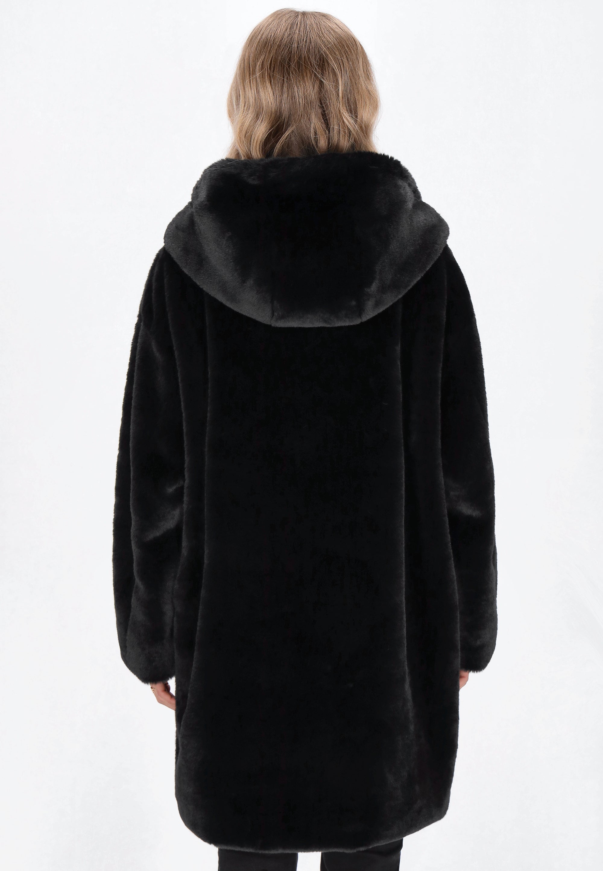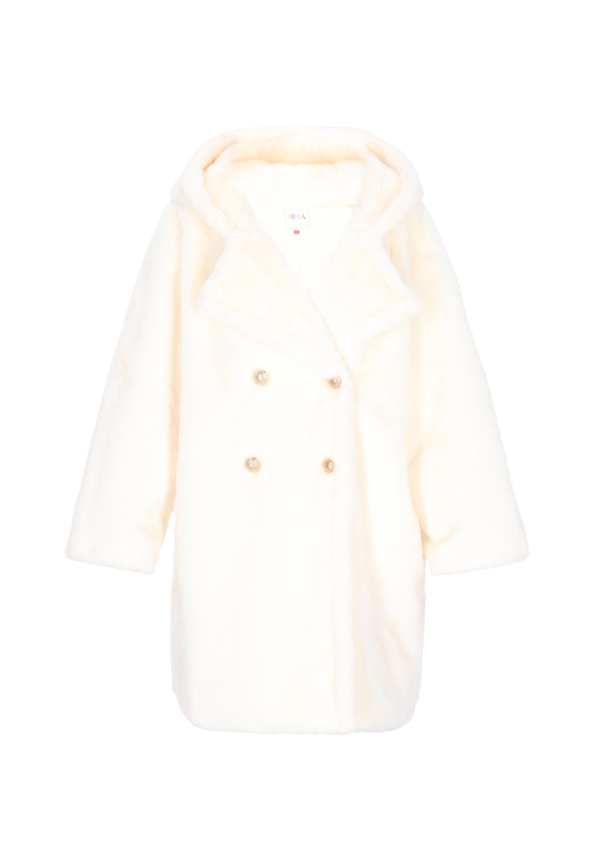 Keyword: button-up, casual, coat, comfy, cozy, double-breasted, faux fur, hood, lapel collar, long sleeves, outerwear collection, plain pattern, pockets, relaxed fit