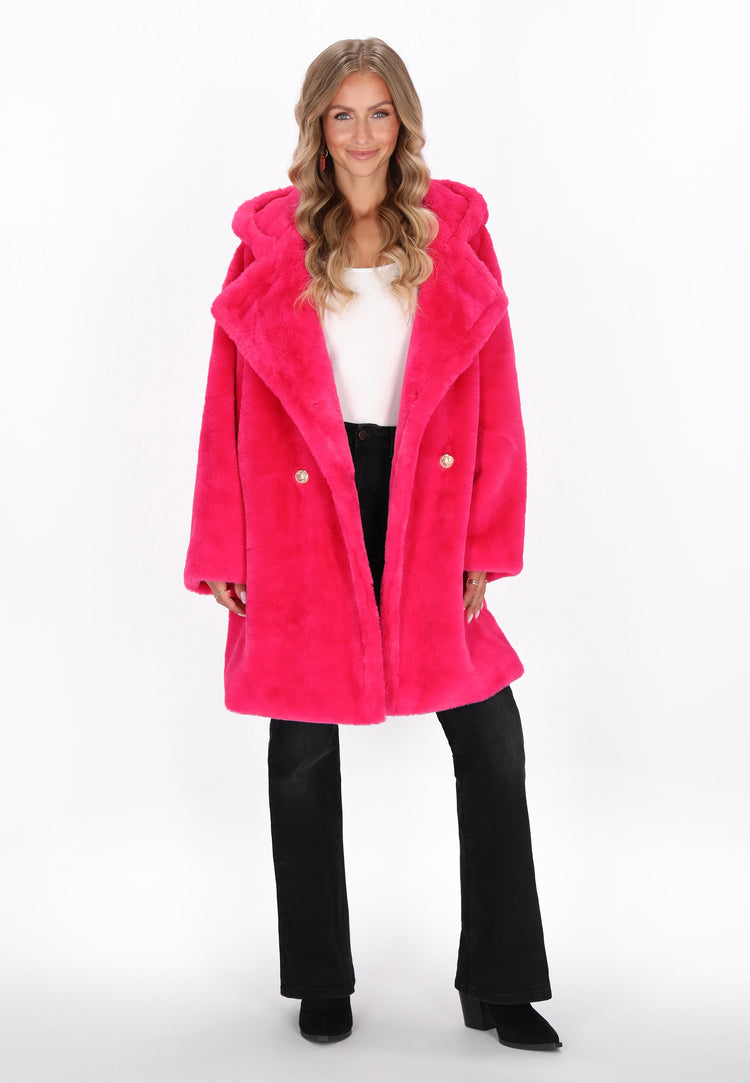 A stylish and functional coat from the Outerwear Collection that combines a fashionable look with comfort. Made of soft faux fur, it provides cozy warmth on colder days. The loose fit allows for freedom of movement, while the classic lapel collar and practical hood add a versatile touch. The coat features long sleeves, a double-breasted button closure, and functional pockets. The plain pattern makes it easy to match with everyday outfits. The perfect choice for those who appreciate casual style and comfort.