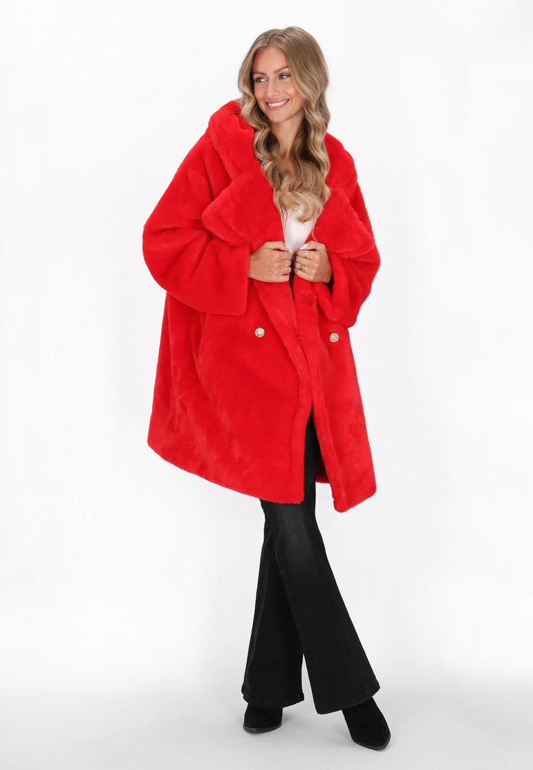 A stylish and functional coat from the Outerwear Collection that combines a fashionable look with comfort. Made of soft faux fur, it provides cozy warmth on colder days. The loose fit allows for freedom of movement, while the classic lapel collar and practical hood add a versatile touch. The coat features long sleeves, a double-breasted button closure, and functional pockets. The plain pattern makes it easy to match with everyday outfits. The perfect choice for those who appreciate casual style and comfort.